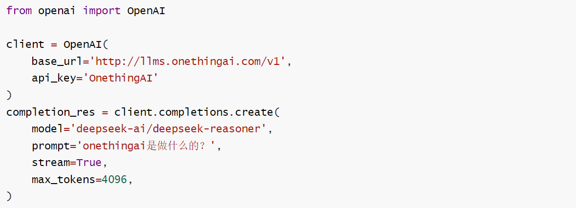 OneThingAI算力云为开发者给予了便捷的免费API接入方式。使用 Python 语言,借助 OpenAI 库即可轻松实现。只需简单几行代码: