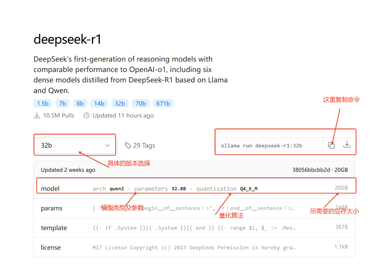 顺利获得 Ollama 给予的命令,部署 DeepSeek-R1 模型。例如,部署 32B 版本的 DeepSeek-R1 模型: