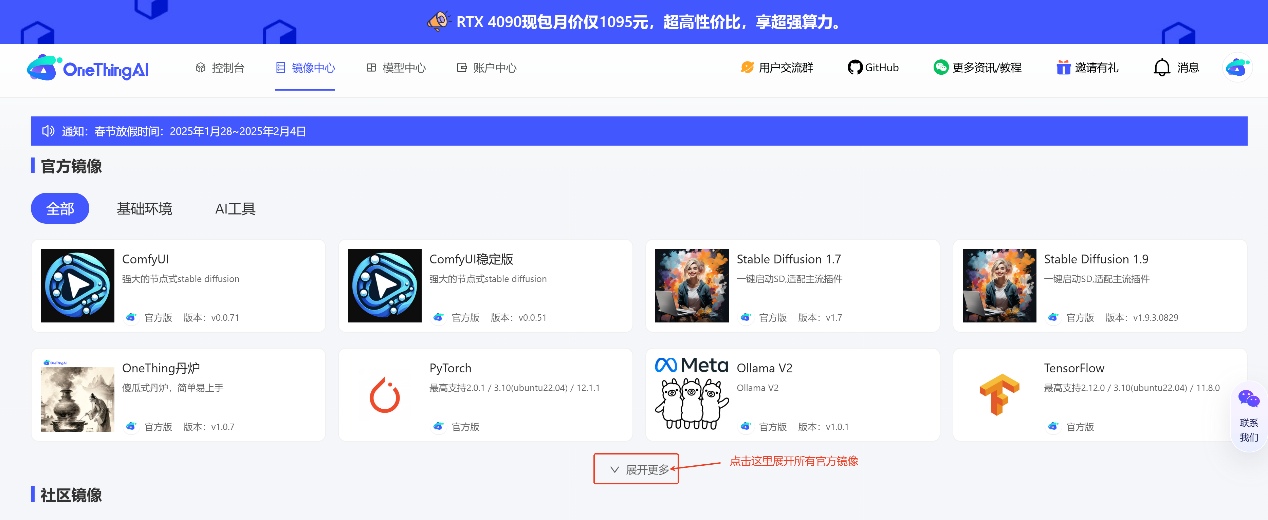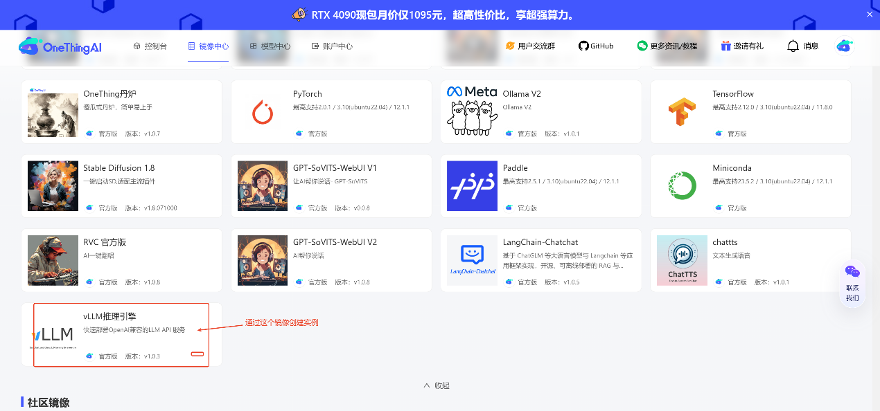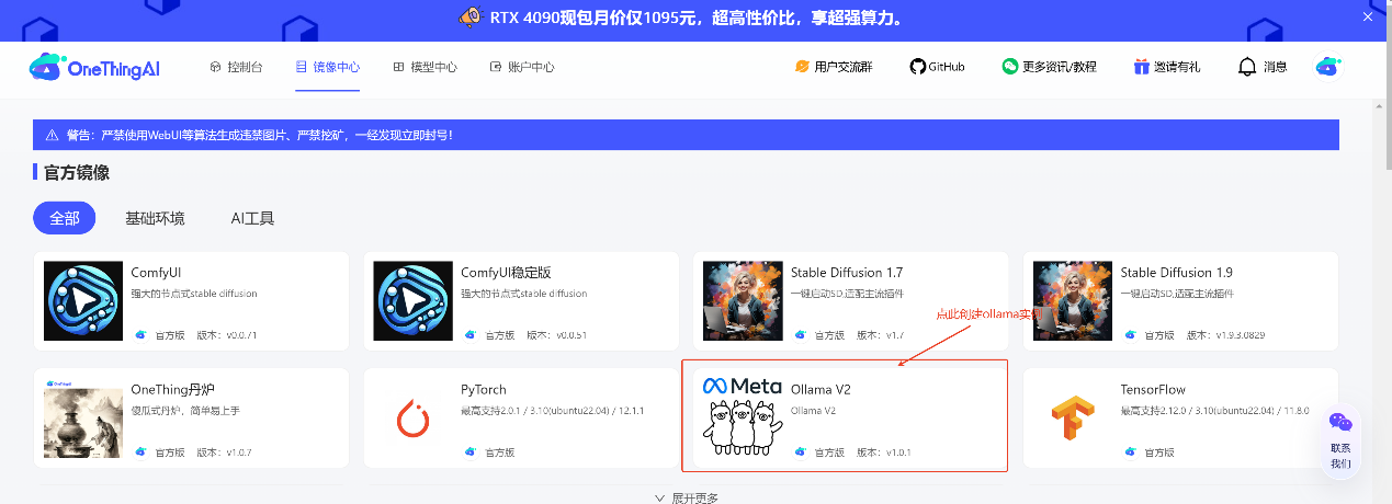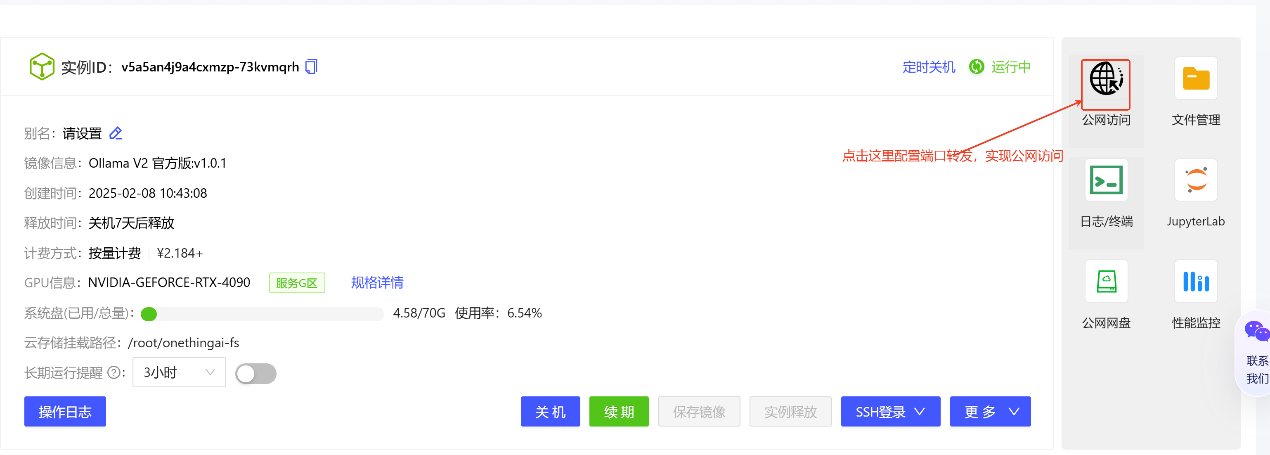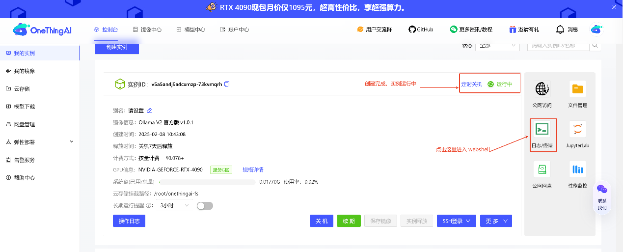 在 OneThingAI算力云上创建一个1卡4090的 Ollama 实例。选择合适的显卡配置,确保显存能够满足模型的需求。例如,32B 的 DeepSeek-R1 模型需要至少 24GB 的显存。