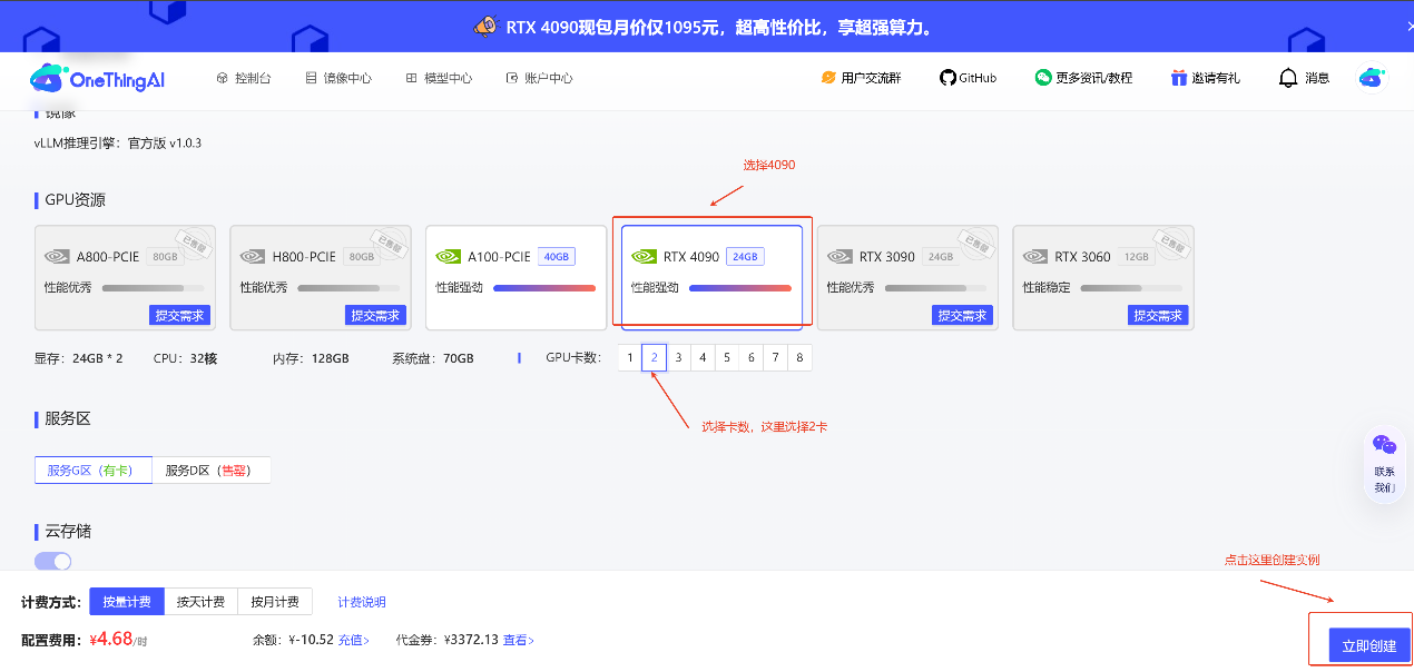 在 OneThingAI算力云 算力云上创建一个2卡的 vLLM 实例,确保显存能够满足模型的需求。例如,Qwen 14B 模型需要至少2卡 4090。