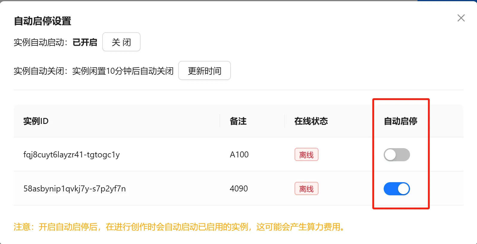 算力实例自动启停:在创作生成过程中,如果没有在线实例,系统会自动挑选1个关机实例开机,然后开始创作生成;当实例闲置时间超过设置时长,将自动关机,避免算力资源浪费,帮大家降低创作成本!