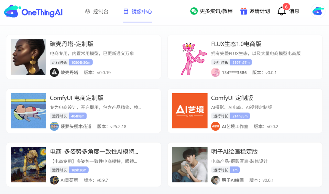 平台整合1000+主流镜像模型及工作流(如Stable Diffusion、Lora、Wan2.1 fp16),覆盖视频创作、图像设计、精修、适配全流程,用户无需自行训练模型,点击即可调用,满足个性化生产需求。