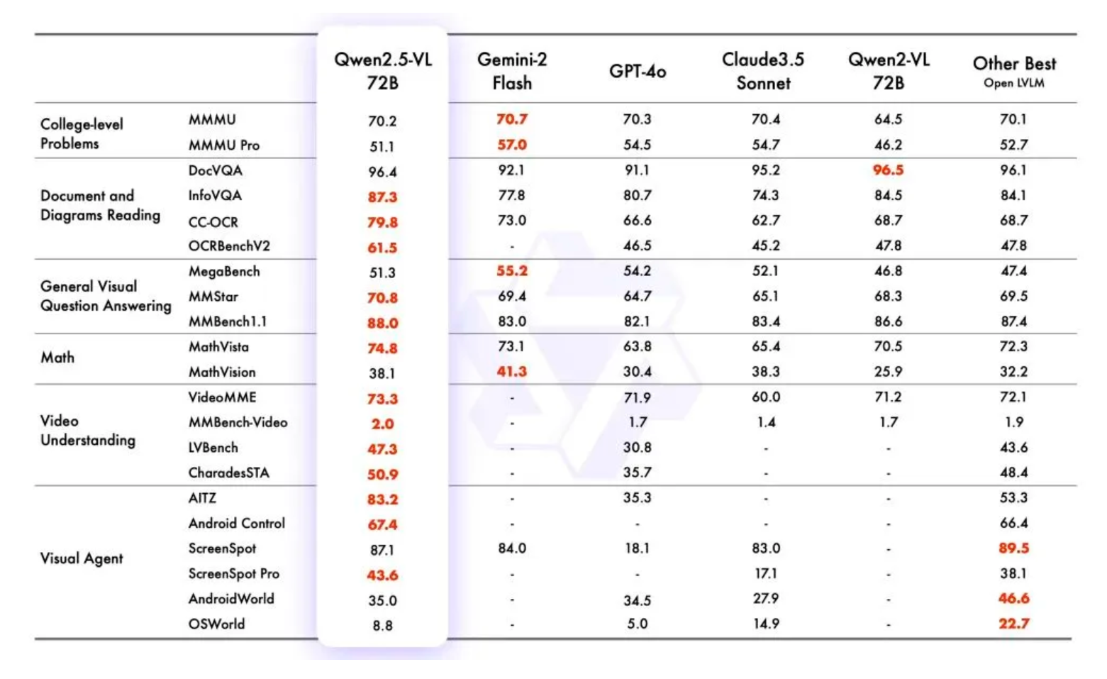 旗舰版Qwen2.5-VL-72B在13项权威评测中夺得视觉理解冠军,在包括大学水平的问答、数学、文档理解、视觉问答、视频理解和视觉智能体方面表现出色,全面超越GPT-4o与Claude3.5。