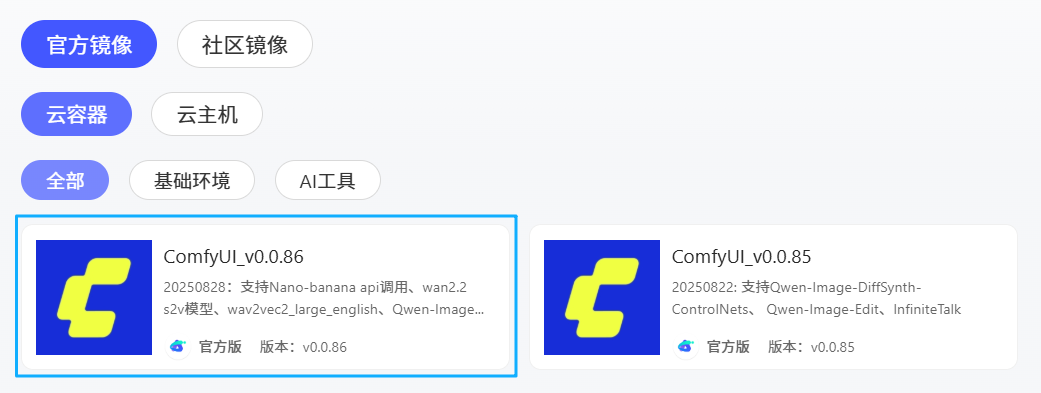 1)登录Ebpay算力云,打开镜像中心并选择“ComfyUl_v0.0.86”快速创建实例。