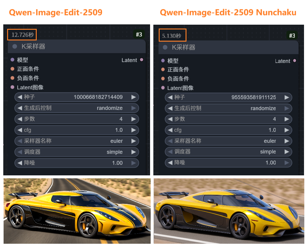 如上,在同等 4090 显卡配置下比对采样耗时,Nunchaku 加持下的模型相对更快,推理速度提升约 50% 以上,整体生成效果符合提示词要求,适合追求高效生成的创作者。