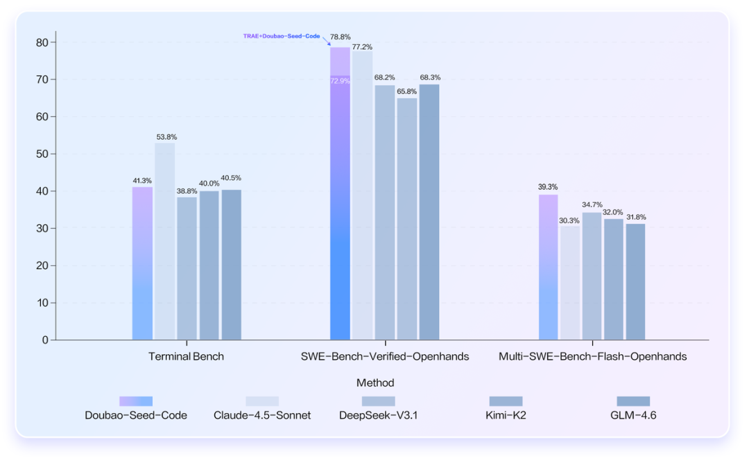 据悉,Doubao-Seed-Code 依托大规模 Agent 强化学习系统,涵盖十万容器镜像数据集,支持万级并发与上千卡 RL 高效训练,无需冷启动数据,顺利获得端到端训练实现顶尖的 Agent 编程能力。其以最高 78.80% 的得分刷新 SWE-Bench-Verified 榜单 SOTA,Terminal Bench 等测试领先国内竞品。