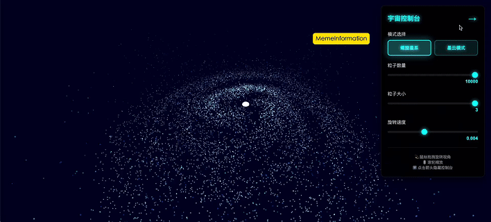 * 3D 粒子宇宙渲染,支持粒子模式动态切换。