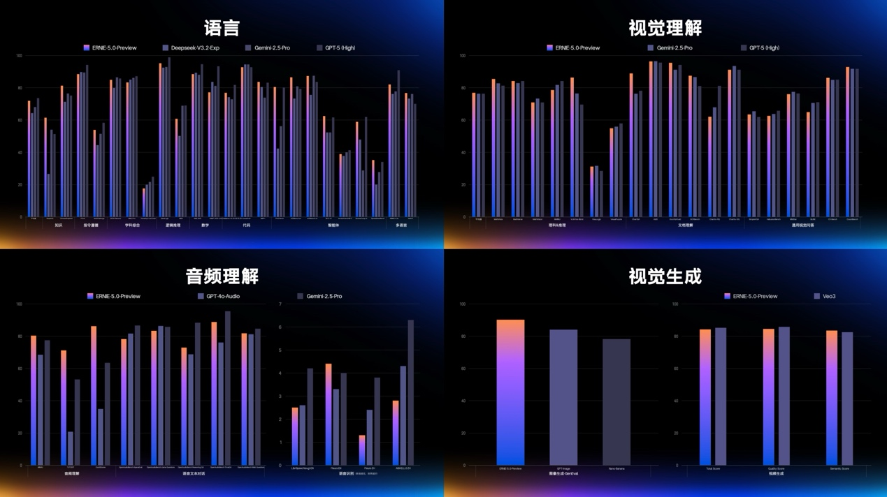 从上述跑分成绩来看,其在语言、视觉理解、音频理解、视觉生成上,已超过多款国内外主流模型。其语言与多模态理解能力与 Gemini-2.5-Pro、GPT-5-High 等模型持平,图像与视频生成能力与垂直领域专业模型相当。侧面验证了“原生全模态统一建模技术”的潜力和能力。