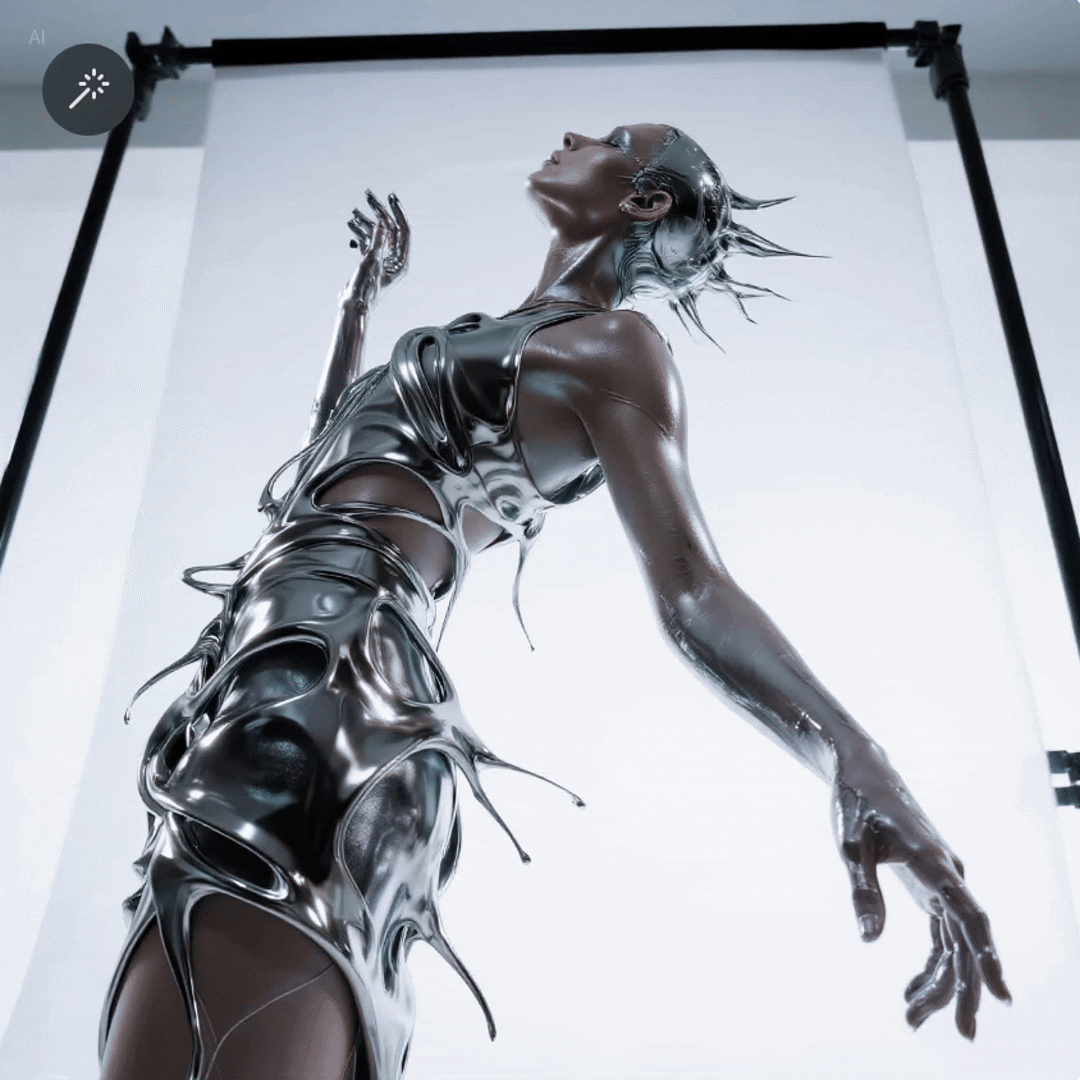 提示词:保持模特的姿势和流动的裙摆形状不变。将衣物材质从银色金属换成完全透明的清水(或玻璃)。顺利获得液态水,模型的皮肤细节清晰可见。光线从反射变为折射。
