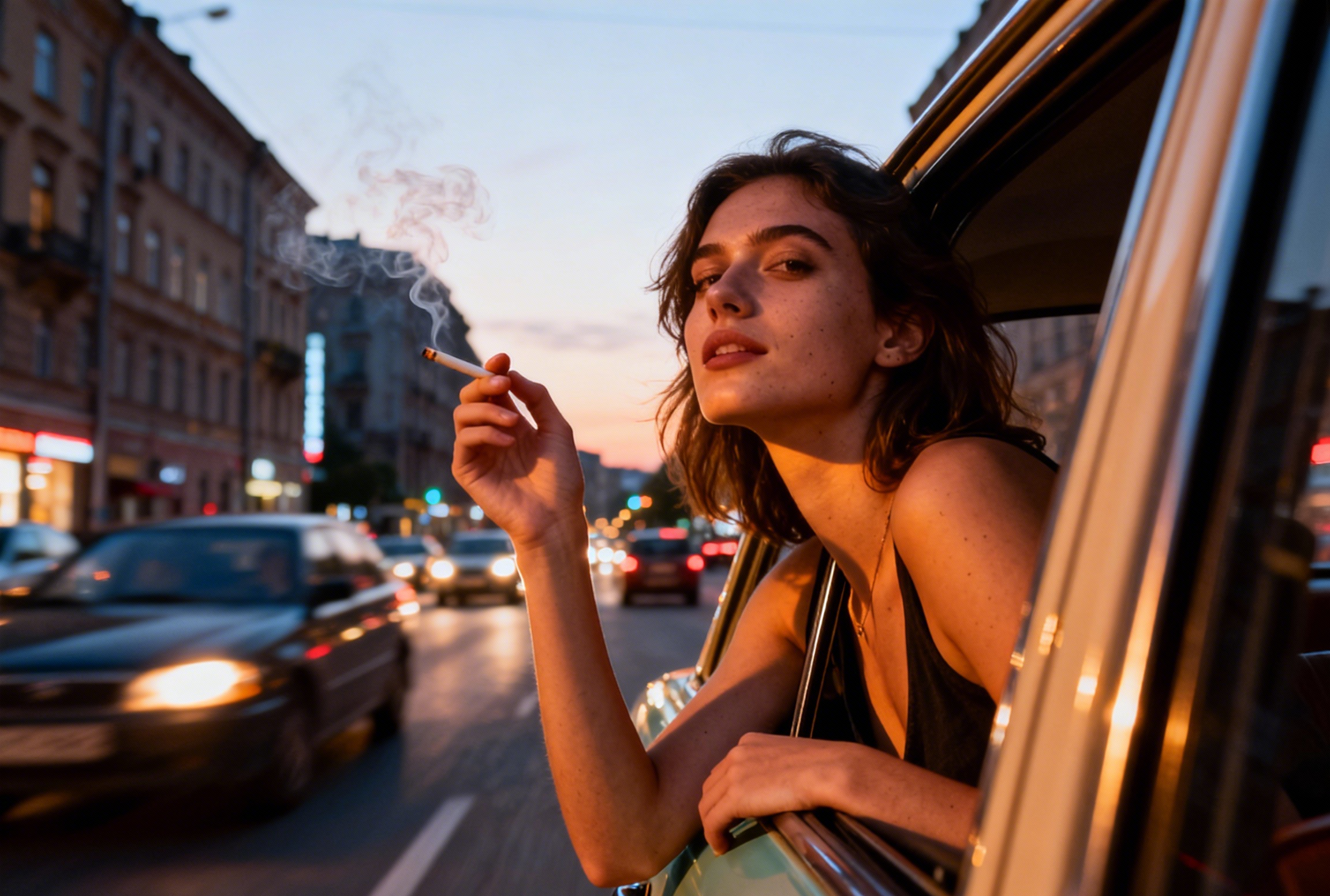 提示词:一张自然、即兴的快照,一位年轻女性随意探出一辆老爷车的窗外,拍摄于欧洲繁忙的城市街道上,傍晚时分。温暖自然的暮光柔和地照亮他放松的脸庞,突显出真实的肌肤质感和手中松松握的香烟淡淡烟雾。背景展示了城市建筑和繁忙的交通,带有轻微的运动模糊,强调了车辆的运动,同时不失主体的清晰锐利感。构图随意倾斜,构图真实自发,唤起真实iPhone拍摄的亲密、动态感,采用电影级RAW风格。