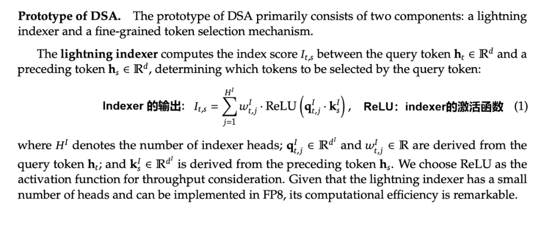 因为 Indexer 是粗选,可以使用 FP8,而 Attention 一般是 FP16,在英伟达GPU 上 FP8 的理论计算吞吐是 FP16 的 2 倍。同时 ReLU 的计算也比 softmax 开销小很多。