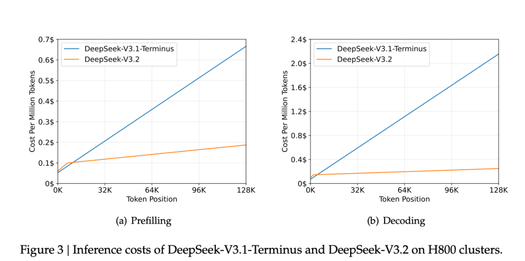 预填充阶段:V3.1 的成本随 token 长度增长呈陡峭上升(128K token 时成本达 0.7 美元 / 百万 token),而 V3.2 的成本增长极为平缓(128K token 时仅约 0.2 美元 / 百万 token)