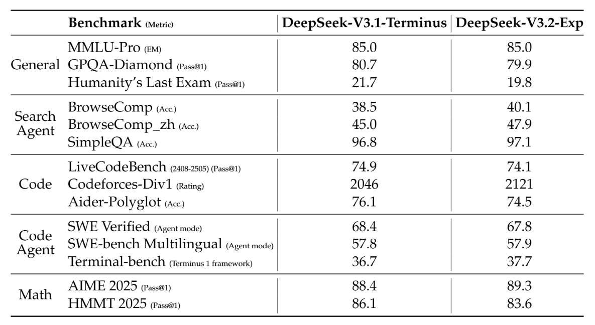 同时基准测试显示,模型在理解、推理等核心任务上的表现与 V3.1-Terminus 持平。