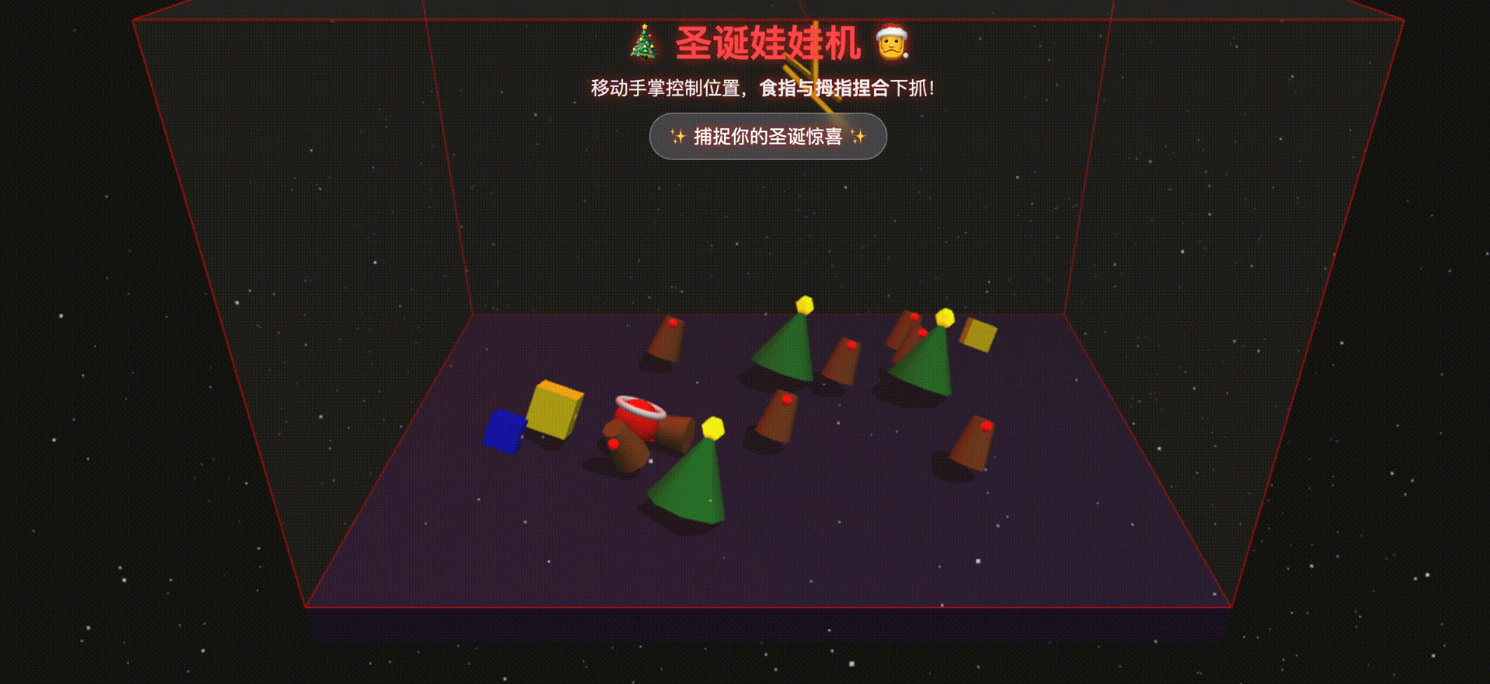 示例:构建一个圣诞风娃娃机(里面有圣诞树、圣诞老人玩偶、麋鹿玩偶、圣诞礼物盒等),使用mediapipe计算机视觉、threejs, 调用网页摄像头,跟着手势,可以进行娃娃机抓取,夹子可以跟着手前后左右移动,捏合后可以抓取,在单html中实现